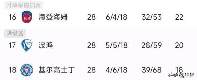 保级区形势严峻,海登海姆22分在升降级附加赛区,波鸿20分、基尔高士丁18分在降级区,多支球队积分接近,后续每一场比赛都可能改变保级格局。