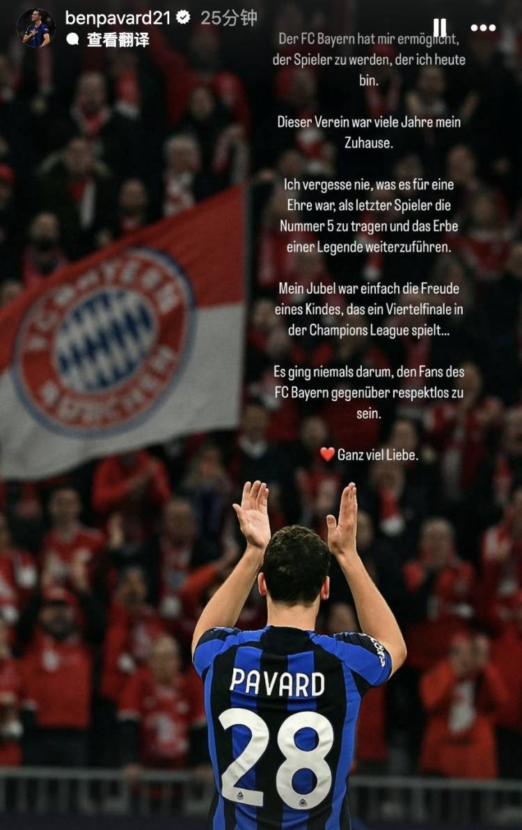 直播吧4月18日讯 国际米兰在欧冠1/4决赛两回合以总比分4比3将拜仁淘汰出局。其中拜仁旧将帕瓦尔在次回合打进关键一球,赛后他通过社交媒体向拜仁球迷致歉。帕瓦尔写道:是拜仁让我成长为今天的球员这家俱乐部曾是我多年的家我永远不会忘记,作为最后一位身披5号战袍的球员,传承传奇的遗产是何等荣耀我进球后的欢...