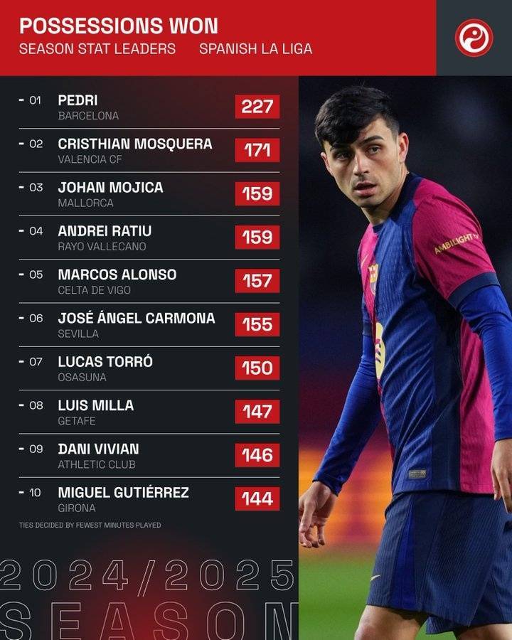 直播吧4月26日讯 Squawka统计表明,佩德里是本赛季西甲唯一一个抢回球权200次以上的球员。