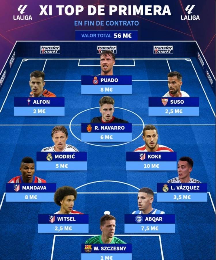 直播吧5月22日讯 2024-25赛季行将结束,多名西甲球星面临成为自由球员的局面,德国转会市场盘点出了西甲自由球员身价最高阵,莫德里奇、什琴斯尼领衔,巴斯克斯、维特塞尔、科克、苏索在列。以下为具体阵容(总身价:5600万欧元):门将:什琴斯尼(巴萨,100万欧元)后卫:曼达瓦(马竞,800万欧元)...